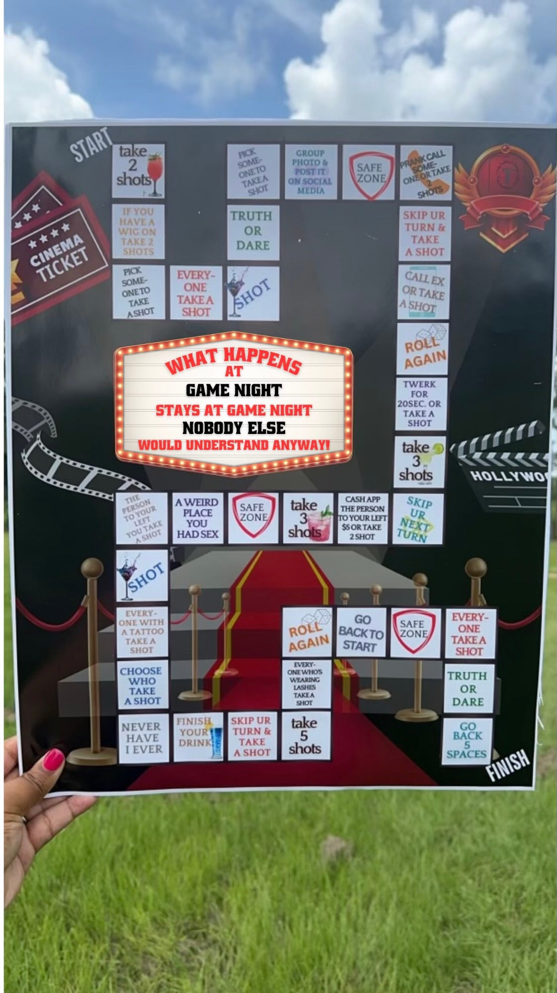 Transform any boring night into a fun and exciting game night with Ladies Game Night! Custom come with instructions, dice, and 4 moving game markers. Plus, enjoy a personalized touch with 2 custom shot glasses. Get ready for endless laughter, competition, and memories with the ladies!